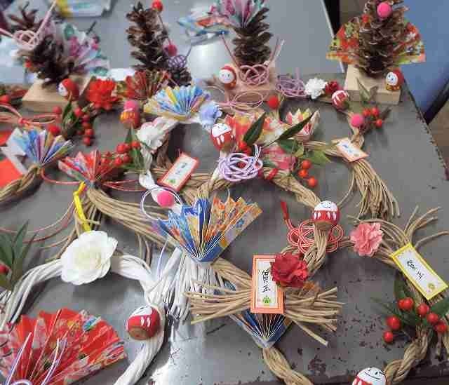 1番目の迎春の飾りはチャレンジ学級の作品です。実に美しいです。家の玄関などにつけたい作品です。