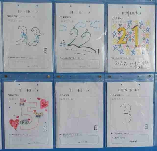 各教室の後ろの掲示はきれいに剥がされ唯一残っている掲示が卒業までの日々を一人1枚担当するカウントダウンカレンダーです。残すところ「あと2日」になりました。思いのこもった1枚1枚がいいですね。
