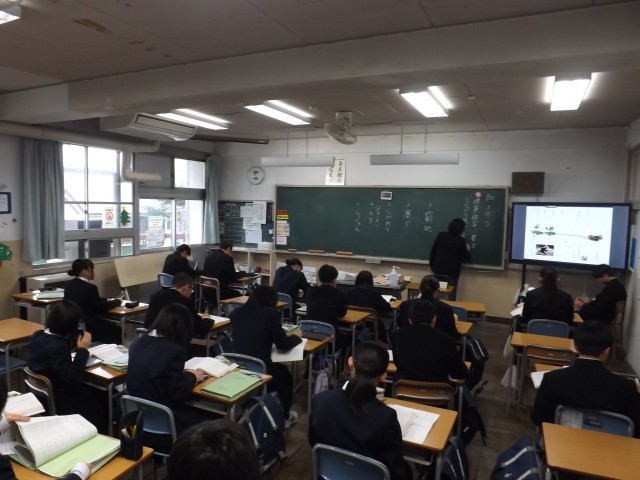 国語の授業では、杜甫の漢詩「春望」(『国破れて山河在り』で知られる作品)を題材に学習を行いました。授業の冒頭では、生徒たちが先生の説明(1つの必修課題と3つの自由課題)を真剣に聞いていました。(画像1...