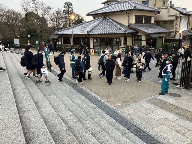 タクシー研修を終えて、清水寺に集合しました。この後、クラス別写真を撮影して、自由散策となります。それにしても、人気スポットのため、すごい人ですね。