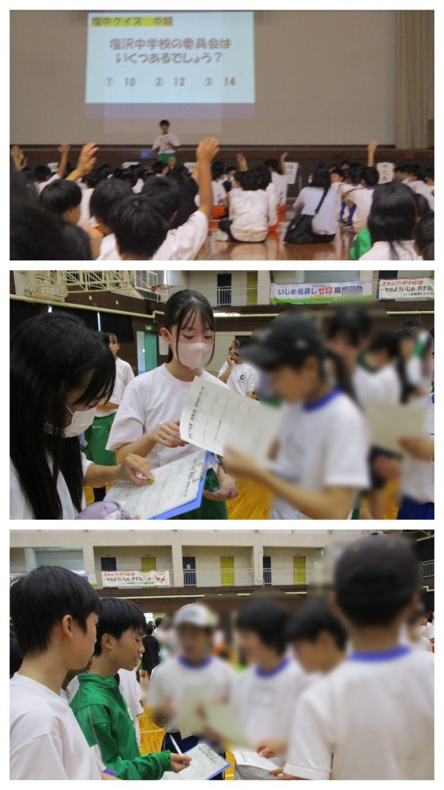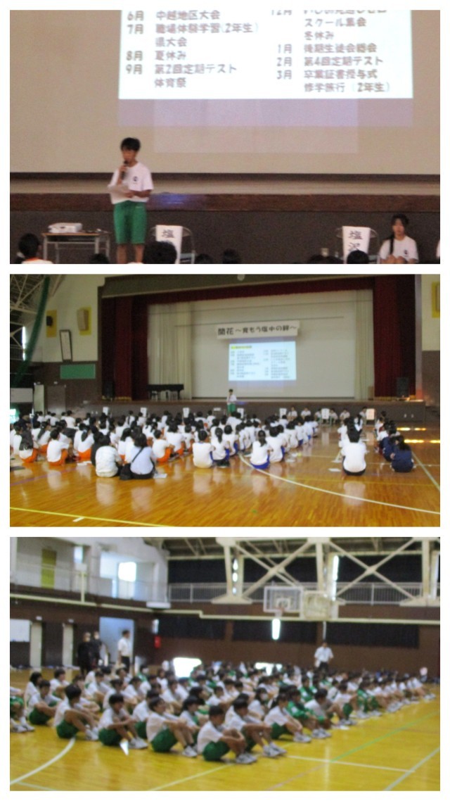 今日は中学校区5小学校の6年生を塩中に招いて「絆集会」を行いました。小6と中1が交流して絆を深め、中学校の様子を知り、中学校入学への不安を軽減する事を目的としています。