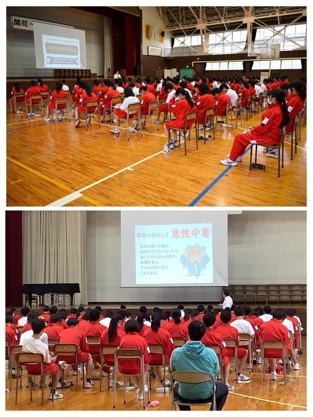 5時間目に2年生対象の薬物乱用防止教室を行いました。薬物による健康や自己形成に及ぼす影響について理解し、自分の心や体を大切にし、自分の健康や行動に責任をもつことの大切さを学びました。