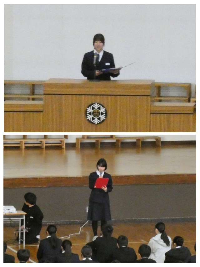 選挙管理委員会からは、生徒会役員選挙についての説明がありました。候補者も全校生徒も、正々堂々と来年度の塩中について考えてくれたらと思います。