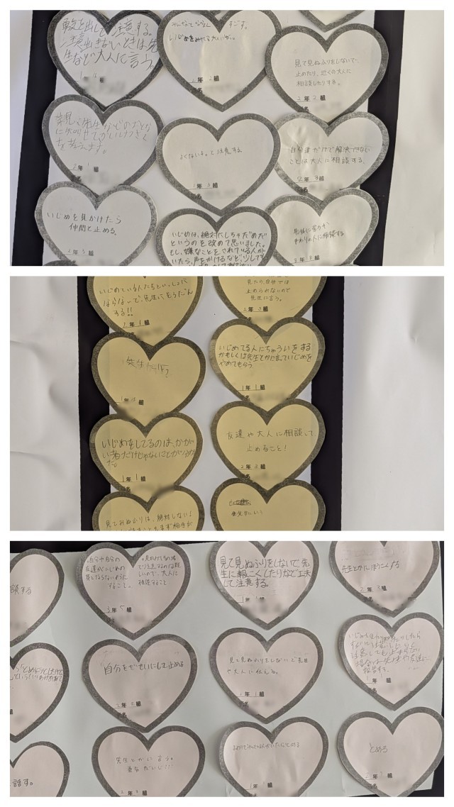 先月行ったいじめ見逃しゼロスクール集会では、塩中からいじめをなくすために全校生徒で考えました。そして、いじめの芽をつむために、生徒一人一人ができることを考え、ハートの紙に記入したもので、生徒会総務がSMILEの文字を作りました。塩中全体にSMILEを広げていきましょう。