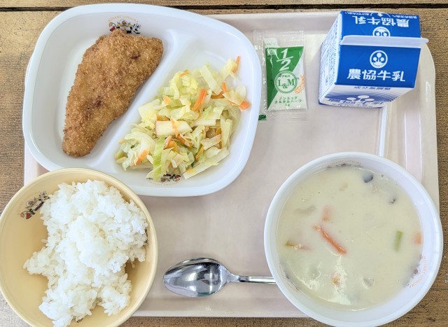給食週間2日目は昭和40年代の給食を再現しました。確かにこういうの出たよなって思える懐かしのメニューでした。その頃は多分パンでしたけどね。