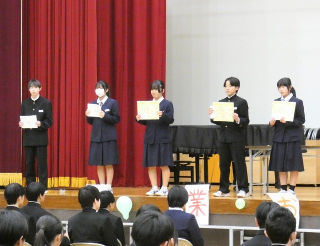 俳句や川柳、書道の表彰を行いました。文化面でも頑張っている塩中生です。