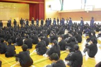 今日の全校朝会は第2回レベルアップ集会を行いました。先週に引き続き、第2回目の集会は行動訓練と教育相談についての説明でした。全校生徒が縦横きれいに列をつくって、集まります。