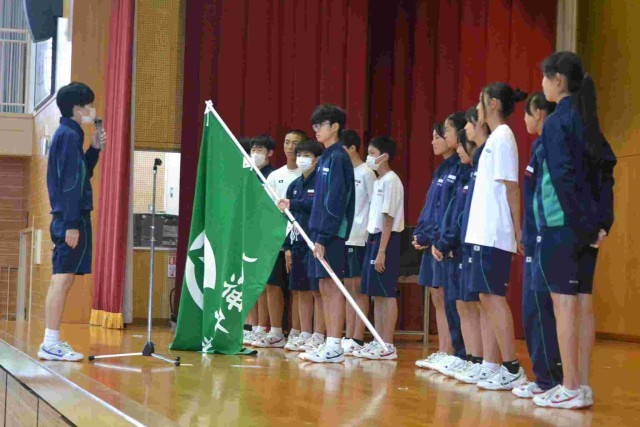 新人大会に参加した部活動と中越地区駅伝大会に出場した駅伝部の生徒たちが、それぞれの大会に参加した結果報告を全校生徒に向けて行いました。