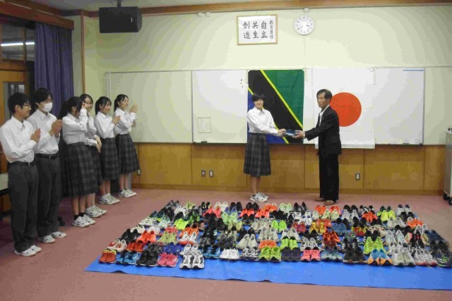 生徒会の奉仕委員会を中心に活動してきた、「タンザニアのはだしの選手に笑顔とシューズを活動」で集まったシューズを南魚沼市陸上競技協会長様へ贈呈しました。