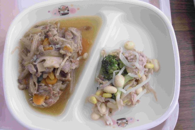地元の食材である「もち豚」「まいたけ」「えのきだけ」「大豆」などを調理した「もち豚ときのこのふる里煮」「南魚沼・恵みサラダ」は、とっても美味しいです。