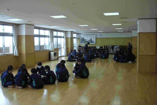 グラウンドに雪が積もって、昼休みに生徒はグラウンドで遊ぶことができません。