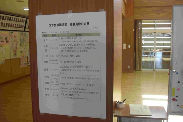 奉仕委員会は、3年生の教室の廊下を卒業を祝う飾り付けをする企画や、保健委員会では、3年生が小学1年生からの9年間でどれだけ身長が伸びたかを調べてその長さのリボンをプレゼントする企画を実施しています。