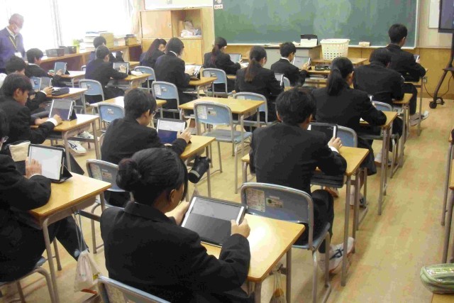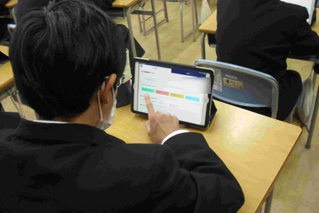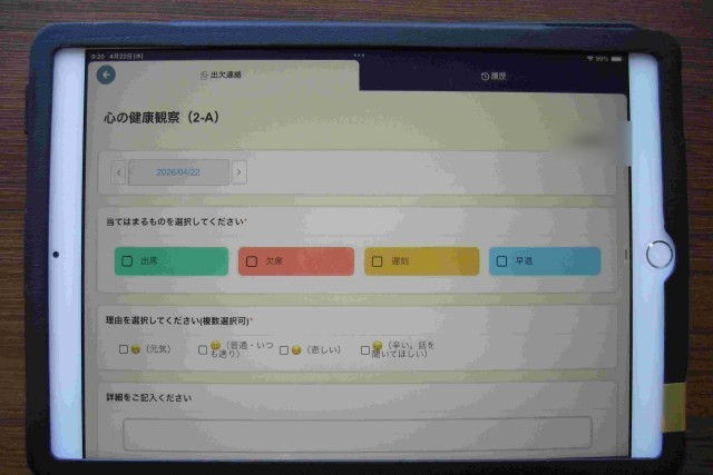 生徒が持っているタブレットで、朝学活の時間に自分の心の状況を報告します。