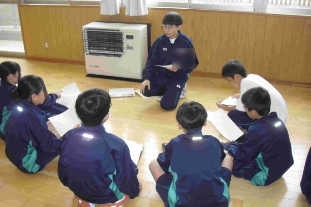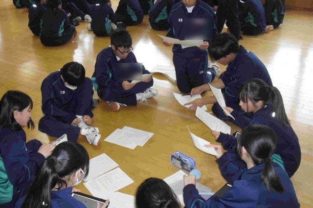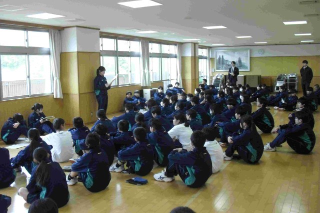 本日昼休み、全学級の班長を集めて全校班長会を行いました。