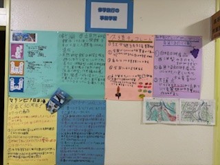 高等部の廊下には、今までの事前学習の成果が貼られています。