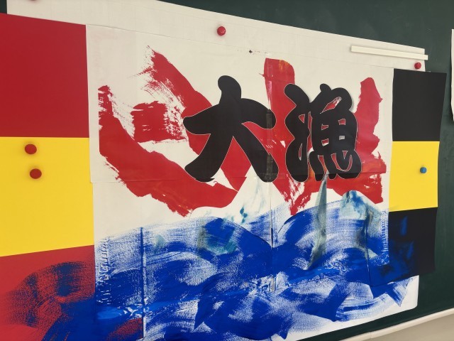 中学部の教室には大道具の一つ大漁旗がありました。