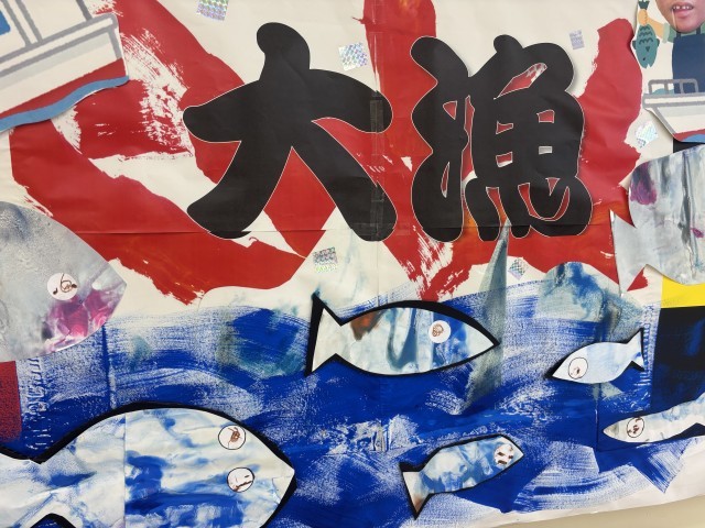 小学部では、先週まで文字と背景だけだった大漁旗に