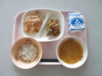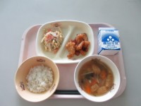 今日の給食は「ご飯 鶏肉の竜田揚げ ダイコーンサラダ 打ち豆のみそ汁 牛乳」でし...