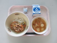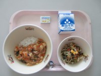 今日の給食は「もやしたっぷり丼 おじゃがもち汁 かみかみ大豆 牛乳」です。「もや...