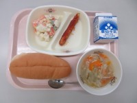 今日の給食は、「背割れ米粉パン カリーブルスト ポテトサラダ チキンスープ 牛乳...