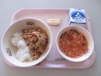今日の給食は「回鍋肉丼 トマトと卵のスープ リンゴ 牛乳」でした。今日は給食セン...