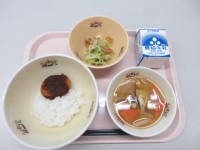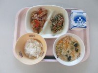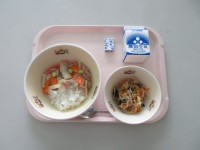 今日の給食は「ごはん 里芋コロッケ いり鶏 白菜のみそ汁 牛乳」です。今日は「和...