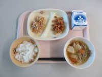 今日の給食は「ごはん ししゃものスパイシー焼き 磯マヨ和え おでん汁 牛乳」です...