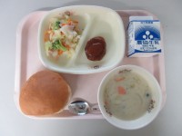 今日の給食は、「ご飯 野菜コロッケ 茎わかめのサラダ 鱈鍋風 牛乳」でした。鱈が...