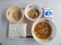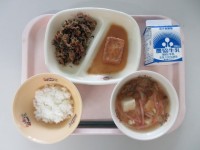 今日の給食は「けんちんうどん じゃこサラダ きなこ豆 牛乳」です。「きなこ豆」は...