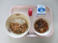 今日の給食は「そぼろ丼 もずくスープ りんご 牛乳」です。今日、調理員さんは34...