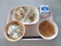 今日の給食は、「ご飯 厚揚げのチリソース しょうゆフレンチ 青梗菜と卵のスープ ...