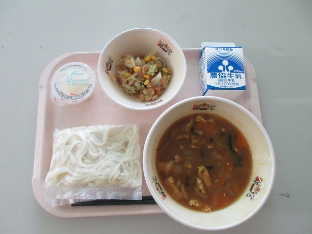 今日の給食は「うどん カレー南蛮汁 パリパリサラダ リンゴゼリー 牛乳」でした。