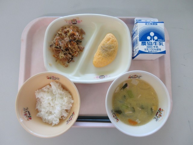 今日の給食は、「ごはん 大豆ミートのオムレツ 春雨の中華炒め 中華コーンスープ 牛乳」です。