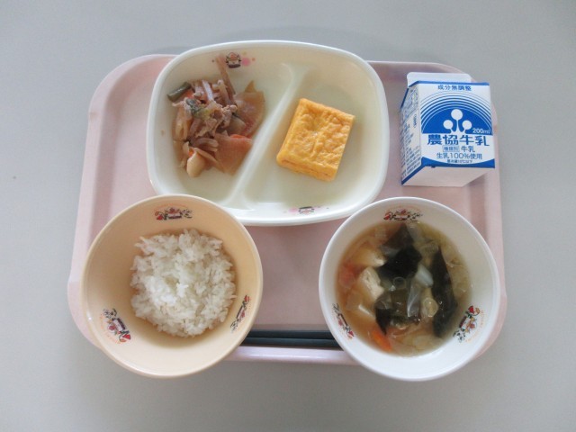 今日の給食は「ごはん 卵焼き 豚肉と大根のうま煮 豆腐のみそ汁 牛乳」です。
