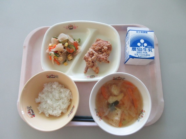 今日の給食は「ご飯 鶏肉の竜田揚げ ダイコーンサラダ 打ち豆のみそ汁 牛乳」でした。