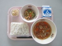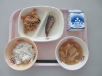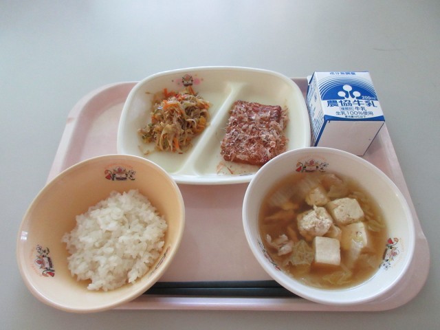 今日の給食は「ご飯 さつま揚げのお好み焼き じゃこ炒め 肉吸い 牛乳」です。