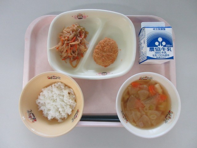 今日の給食は「ご飯 かつおカツ 切り干し大根の焼きそば風 減塩みそ汁 牛乳」でした。