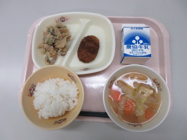 今日の給食は、「ご飯 キャベツメンチ 卯の花入り 白菜のみそ汁 牛乳」でした。