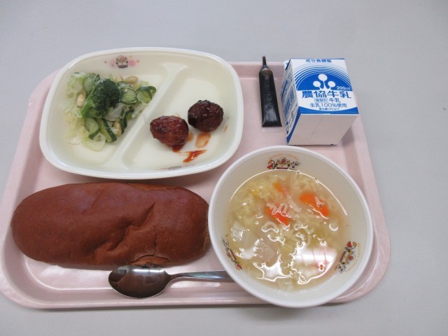 黒糖パン、ミートボール、ABCスープ、ミルメークが登場しました。