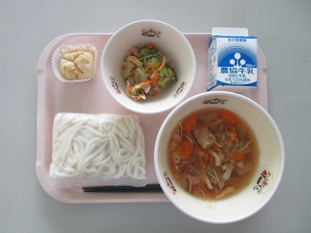 今日の給食は、「うどん きつね汁 ツナサラダ 手作りさつまいも蒸しパン 牛乳」です。