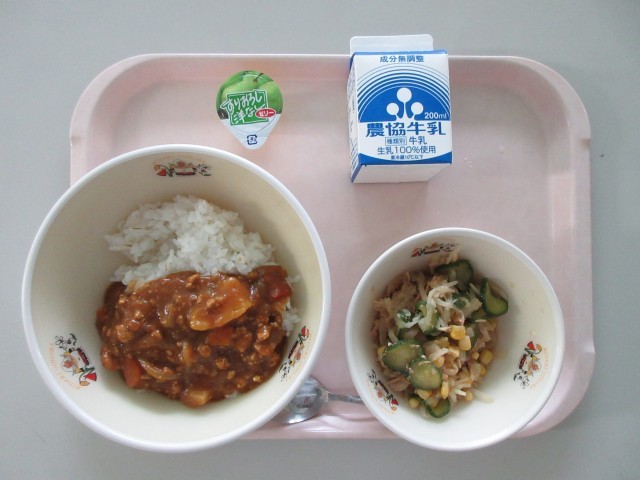今日の給食は「レンコン入りカレー 牛乳 もやしと切干し大根のさっぱり和え ミニゼリー」です。