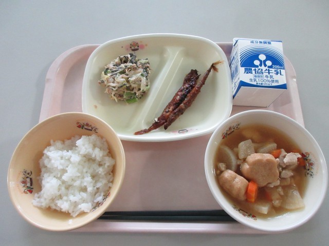 今日の給食は「ごはん ししゃものスパイシー焼き 磯マヨ和え おでん汁 牛乳」です。
