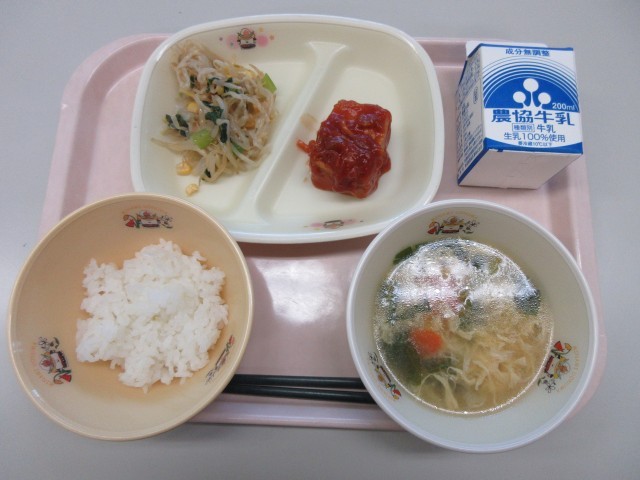 今日の給食は、「ご飯 厚揚げのチリソース しょうゆフレンチ 青梗菜と卵のスープ 牛乳」でした。
