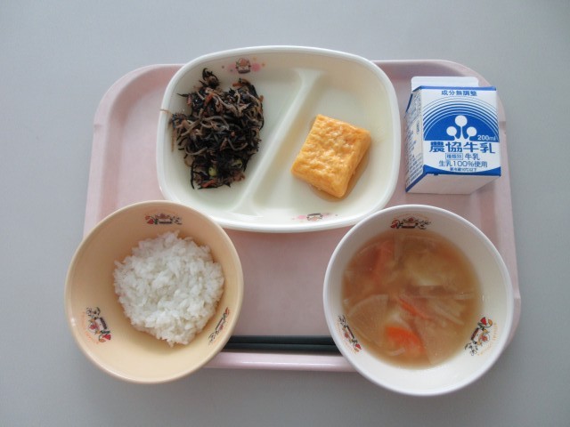 今日の給食は、「ご飯 卵焼きのあんかけ ひじきの炒め煮 大根とさといものみそ汁 牛乳」でした。