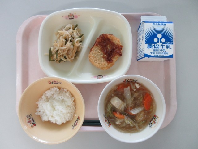 今日の給食は、「ご飯 野菜コロッケ 茎わかめのサラダ 鱈鍋風 牛乳」でした。