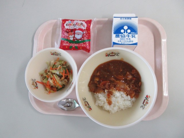 12月16日(火)の給食 公開日 2025/12/19 更新日 2025/12/19 今日の給食 今日の給食は、「ハッシュドポーク 豆じゃこサラダ クリスマスデザート 牛乳」でした。今日は早めのクリスマスデザートでした。みんな大喜びでした。 いいね(0)