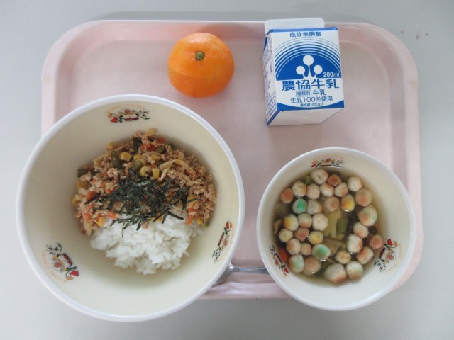 今日の給食は「海の物、山の物丼 チンドン屋さんすーぷ ミカン 牛乳」でした。
