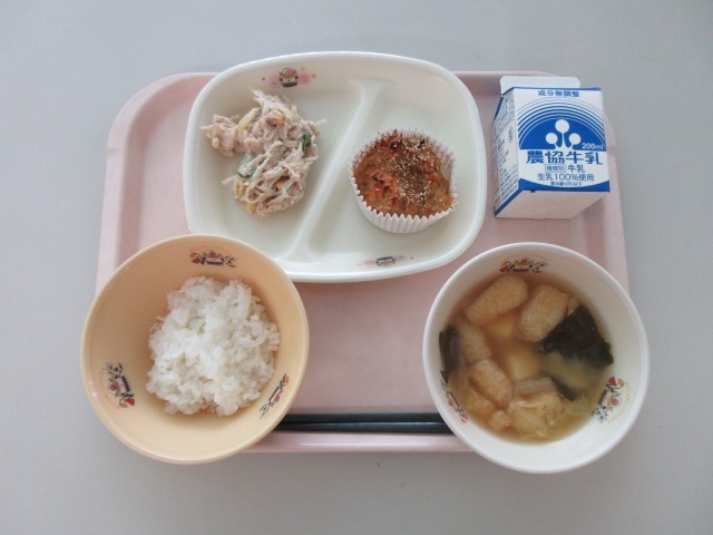 今日の給食は「ごはん カップ松風焼き 切干だいコーンスープ 豆腐のみそ汁 牛乳」です。