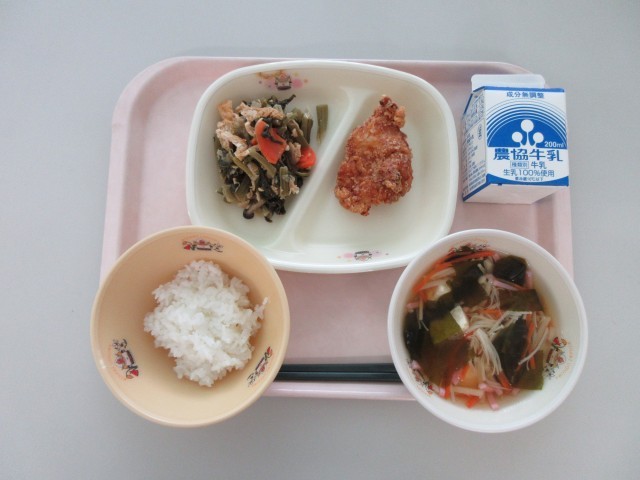 今日の給食は「ごはん 鶏の唐揚げ 煮菜 すまし汁 牛乳」です。