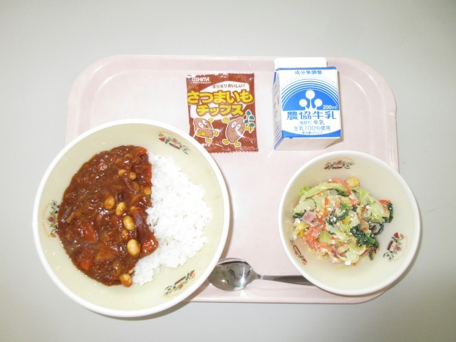 今日の給食は「ツナハヤシライス 雪んこサラダ おさつチップス 牛乳」です。